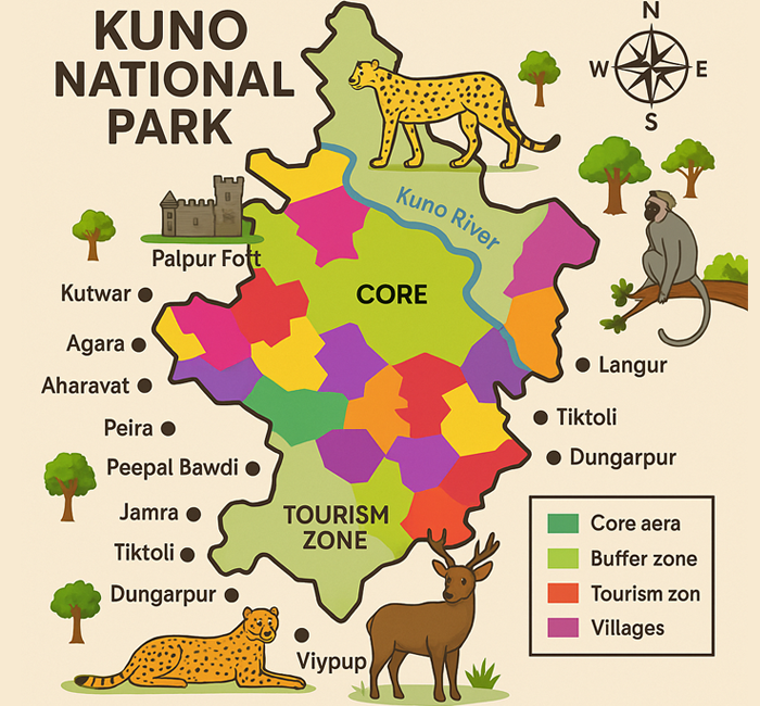 - Major Attractions: Cheetah reintroduction, leopards, sloth bears, nilgai, sambar, chinkara, birds; scenic Kuno River